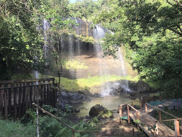 We asked at reception for rent a car options. Since it was our last day, we wanted to pick up the car in the hotel and to drop it at the airport the next day. They said it was possible and it costs 60 USD, which we happily payed. In the car there was a map with the most important sights of the island with description. We had our tank full and enough water for a day, just in case there wouldn’t be any shops or gas stations. We learned our lesson in Peleliu. On Babeldaob is a nice road, that goes all around the island, so it is very easy to follow the map. Well, so it seemed. Our first stop should be Ngatpang Waterfall. We have read that it should be near the main road, but the path is not marked. We found the spot where it should be, but we couldn’t find the waterfall. To be honest, we weren’t even trying to much, because our main plan was to see the Ngardmau Waterfall. Well, we didn’t read a lot, we just saw a picture of a beautiful waterfall, that we wanted to see in person. We found the spot, payed the entrance fee of 10 USD per person and started walking towards the waterfall in the flip flops. There was a lot of stairs and walking in the water, and somewhere during the walk, we started to think about our water shoes, that we left in the trunk. Really good Scubapro water shoes, that are made for situations like this. Well we managed the little hike in flip flops, but I really recommend taking water shoes with you.